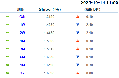 上海银行间同业拆放利率 (Shibor) 短期品种小幅波动,7 天和 14 天品种下跌。具体来看,隔夜 Shibor 上涨 0.10BP,报 1.3150%;7 天 Shibo 下跌 2.40BP,报 1.4230%;14 天 Shibor 下跌 2.10BP,报 1.4450%。