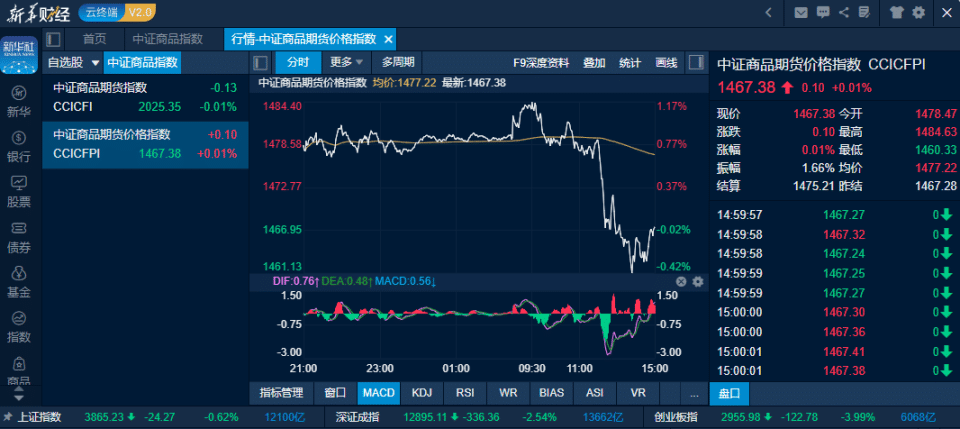 图为中证商品期货价格指数日内走势图 (来源:新华财经专业终端)