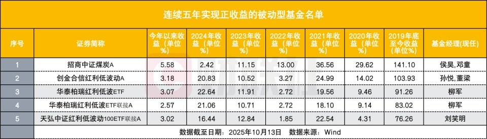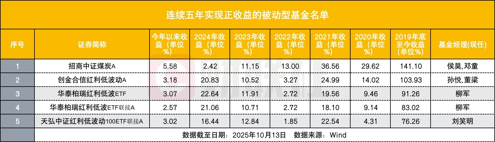 分主题类型来看,连续五年实现正收益的被动型产品中,红利低波主题产品有 4 只,煤炭主题产品有 1 只。