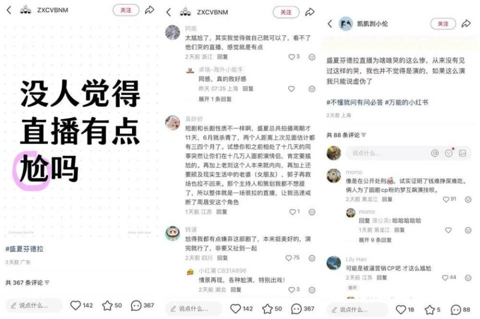 而红果在直播策划中没有把握住对主创团队的边界感,进而导致了演员也拿捏不住 「演」 和 「真」 的分寸感。