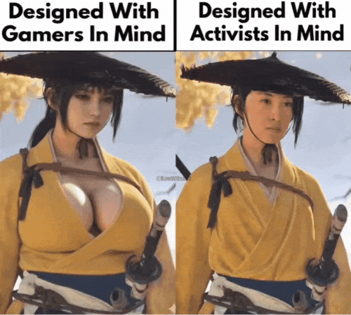 这个梗图模板左边说的是 「玩家想要的设计」,右边大概意思是 「觉醒文化积极分子想要的设计」