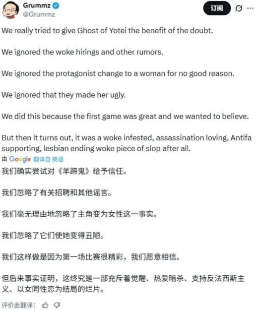 所以,在游戏正式上线后,像 「Grummz」 之类的 「反 DEI」 先锋,就迫不及待地将游戏端上饭桌,开始对它大加批判,认为 「镜井仁」 带来的好名声,都被 「笃」 的脸部建模给搞臭了。