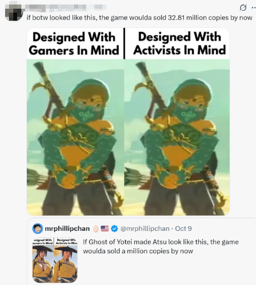 最近,X 上讨论 《羊蹄山之魂》 的第一热帖,应该是这位叫 「mrphillipchan」 的网友,对游戏主角 「笃」 的长相指指点点的帖子。他在帖子里用 AI 捏了个新的 「笃」,有着一张像是在韩国网游里出来的漂亮面孔,以及难以掩盖的爆衣大雷,说如果 「笃」 长成这样,那 《羊蹄山之魂》 早就卖过 100 万了。