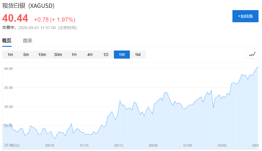 9 月 1 日周一,白银价格突破 40 美元/盎司关键关口,为 2011 年以来首次,年内累计涨幅超过 40%。当前,现货白银报 40.44 美元/盎司,涨幅近 2%。