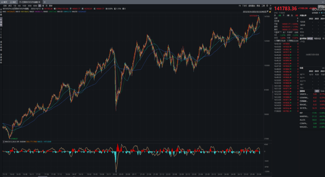 公开资料显示,伊博维斯帕指数的成分股中包含淡水河谷(Vale)、巴西石油公司 (Petrobras) 等与大宗商品、资源型经济紧密相关的企业,其走势可能与国际商品价格、中国需求等因素关联紧密。作为重要的新兴市场资产指数,截至 10 月 14 日,伊博维斯帕指数今年以来收益率为 17.87%。