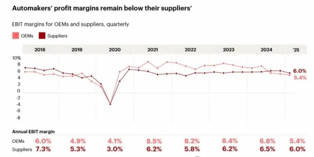 据贝恩咨询公司 (Bain & Co)称,2025 年第一季度汽车整车厂商 (OEM)利润率持续下滑,降至 5.4%,这一结果还标志着,供应商利润率已连续第三个季度超过整车厂商,但供应商利润率估计也仅为 6%。