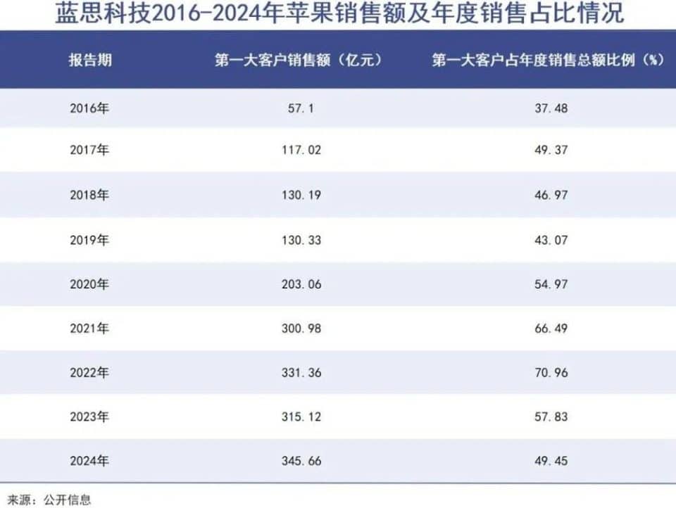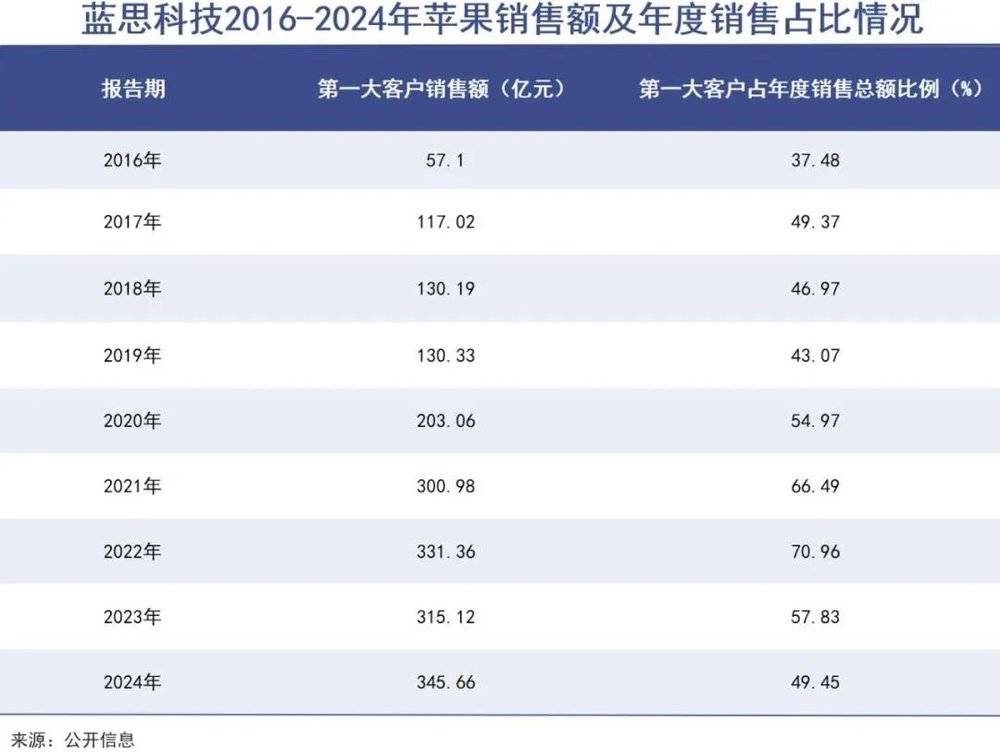 根据财报数据,2024 年,歌尔股份对第一大客户销售占比为 31.96%,而 2023 年该数据达到了 43.38%;领益智造 2024 年第一大客户销售占比为 22.07%,2023 年则为 24.22%;2024 年,蓝思科技的第一大客户销售占比为 49.45%,2023 年该数据为 57.83%,2022 年高达 71%。显然,这几家公司对第一大客户也就是苹果的依赖程度,有不同程度的下降。