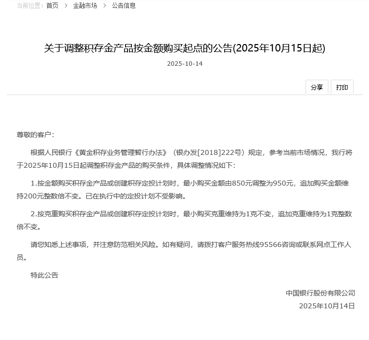 财联社记者注意到,中国银行今日也正式发布了关于调整积存金产品按金额购买起点的公告。在公告中,中国银行表示,根据人民银行 《黄金积存业务管理暂行办法》(银办发 [2018]222 号) 规定,参考当前市场情况,该行将于 2025 年 10 月 15 日起调整积存金产品的购买条件。