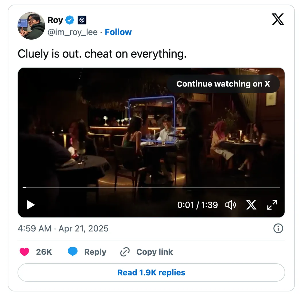 Cluely 最核心的差异化优势并非技术,而是其品牌定位和市场策略。它是市场上唯一一个,也是第一个敢于公然以 「作弊」 为卖点并获得巨大成功的公司。