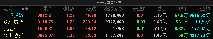 黑马财经财经讯 10 月 15 日,市场探底回升,沪指涨超 1% 重回 3900 点,创业板指探底回升涨超 2%。截至收盘,沪指涨 1.22%,深成指涨 1.73%,创业板指涨 2.36%。沪深两市成交额 2.07 万亿,较上一个交易日缩量 5034 亿。