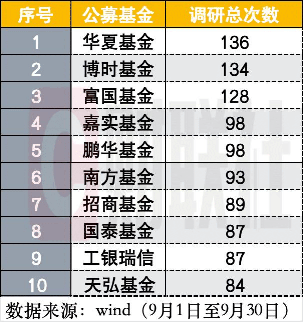 据 wind 数据,在公募 9 月调研总次数排名前十、调研个股总数排名前十的两大队列中,仅第十名公募存在区别,其余 9 家公募均是同一批公募,仅排位名次有所差异。