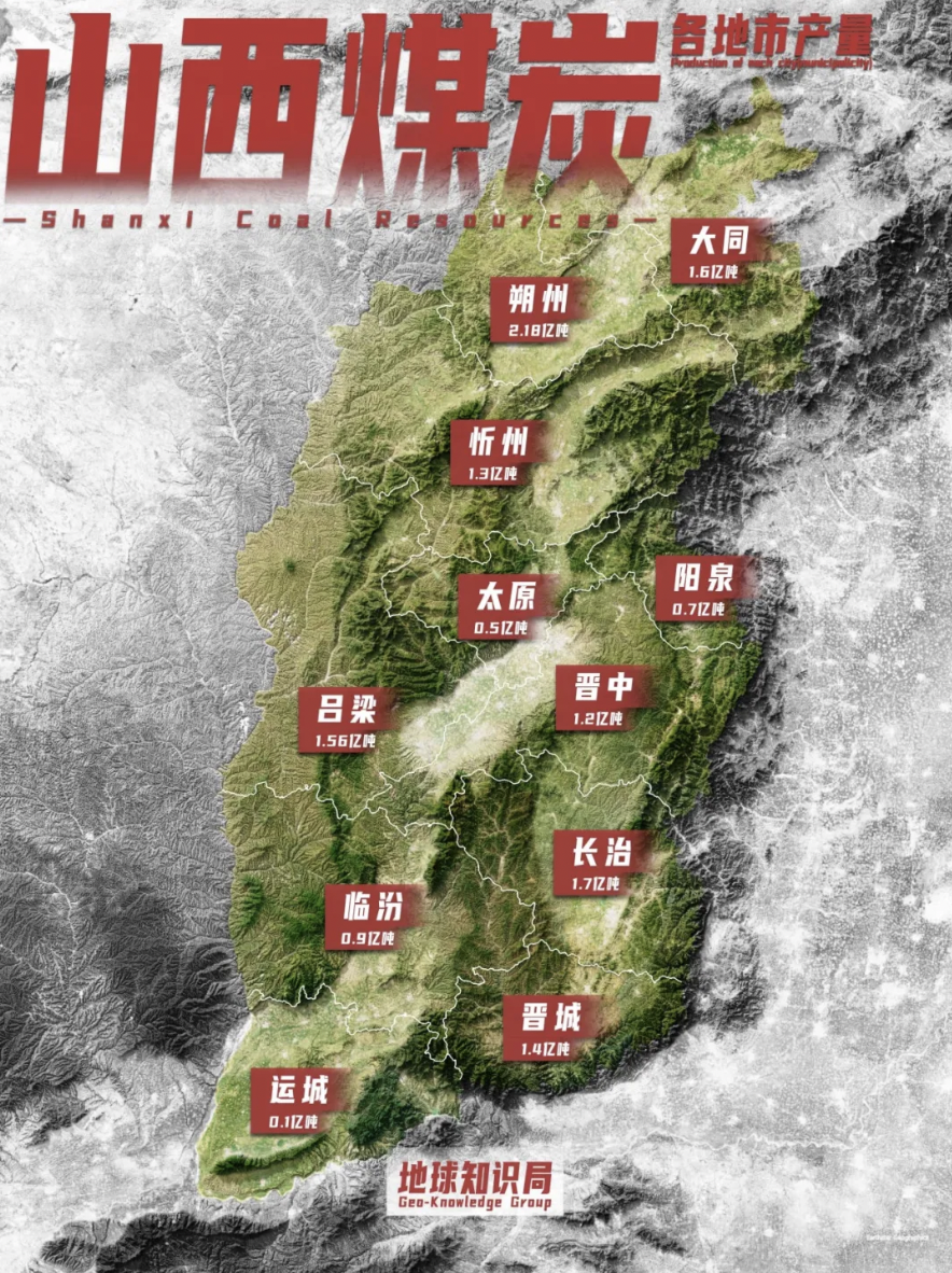 山西一省十一市,每一个都在大量产煤,有 7 个产煤过亿,其中朔州过 2 亿吨。就连看起来主要负责花钱的省会太原,每年也能挖出半亿吨煤,跟甘肃这种采矿大省差不多。一市顶一省,也是非常硬核了。