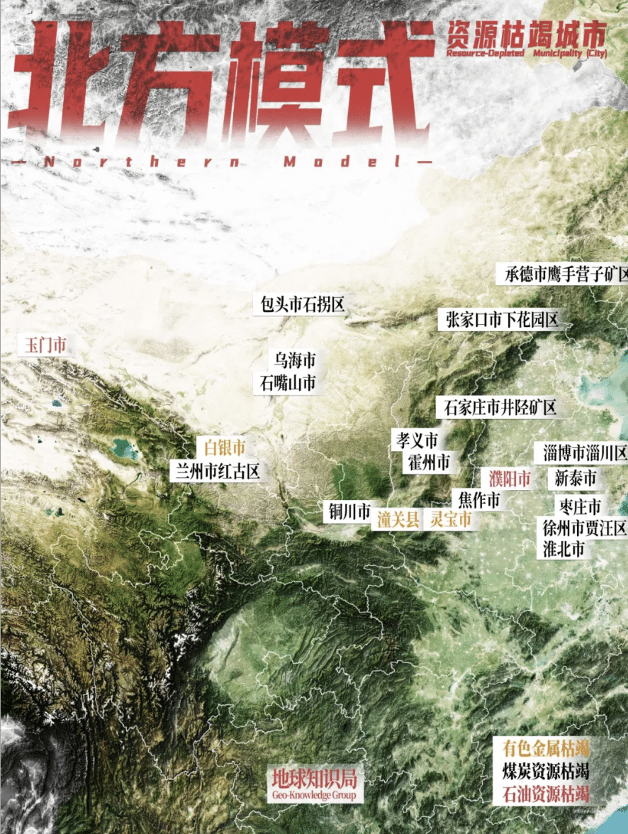 但中国资源枯竭的城市,又何止东北一处。华北和西北这两北地区,共同组成了辽阔的北方模式。相比东北老铁高度一致的 「铁锈带叙事」,他们的命运可谓冰火交加。