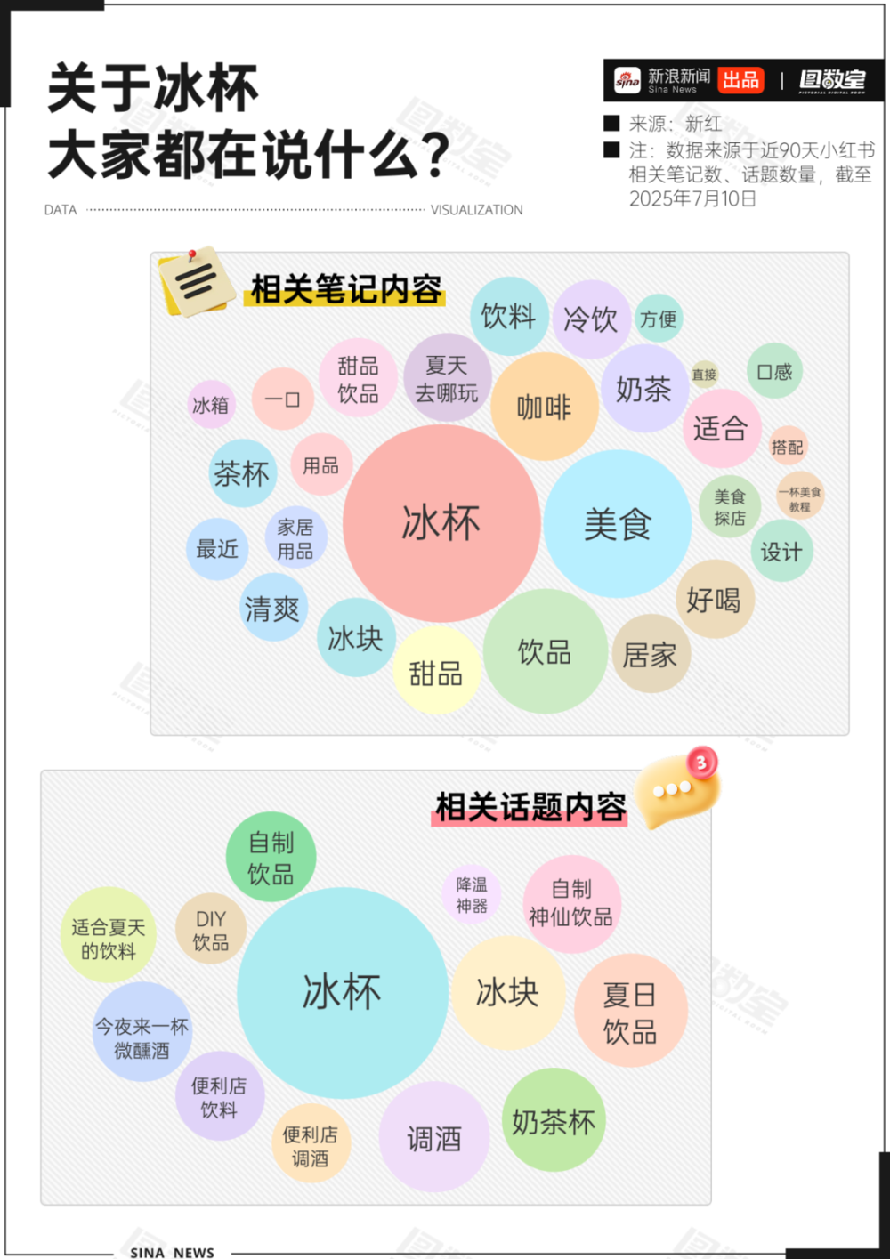 通过查询小红书近 90 天有关冰杯的相关笔记和话题内容,关键词都围绕着 「方便、好喝、清爽、夏天、调酒、DIY、奶茶、微醺、便利店」 展开。