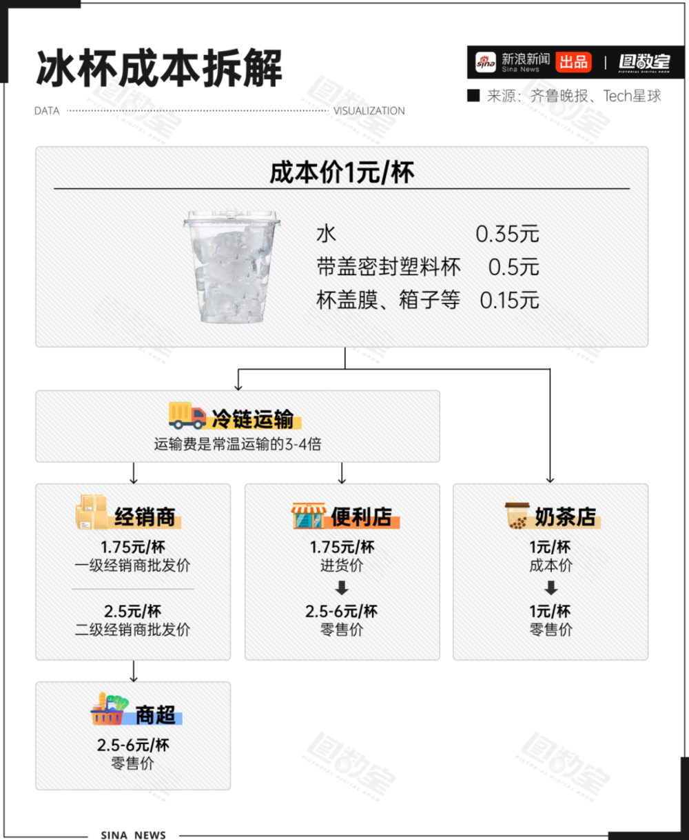 另一方面,一个冰杯从工厂到商店,再到我们手里,中间过程可不简单。冷链运输、经销商层层加价、店铺房租人工水电……这些成本堆起来,一杯冰就得卖 2.5~6 元。相比之下,奶茶店的冰杯由于现制现卖,没有中间商赚差价,因此可以 1 元成本价拿下。