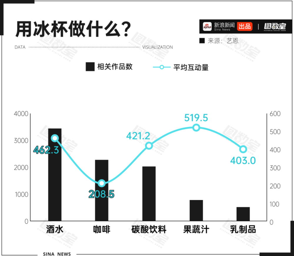 酒、奶制品、茶、咖啡、碳酸饮料、果蔬汁,只要是 「稀的」 都能放进冰杯里,再加上奶盖、炼乳、果冻等产品,多巴胺的配色、丰富的配料和创意搭配,都让冰杯成为了社交货币。