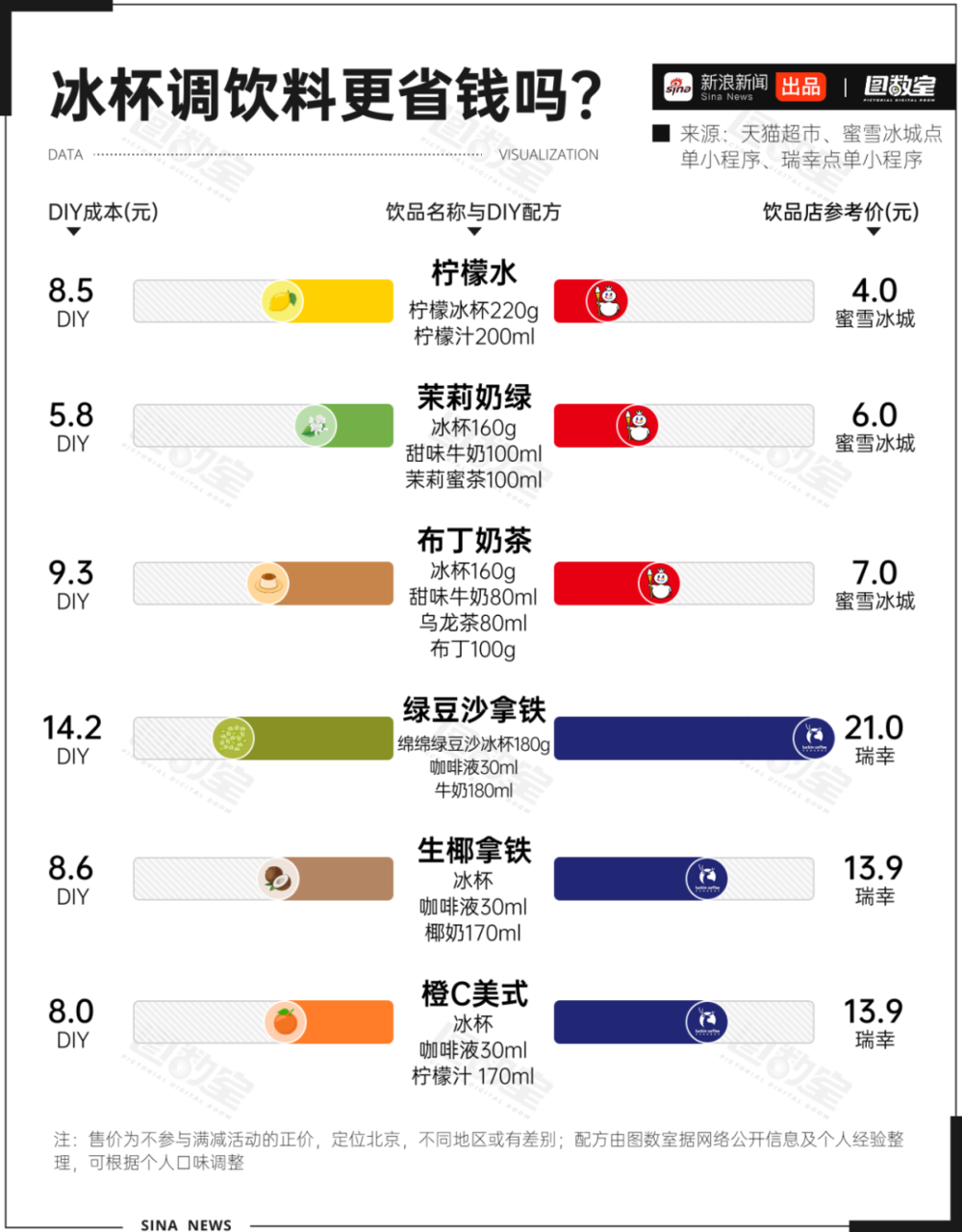 那么,自制冰杯饮料真能省钱吗?图数室帮你们算了一笔账,把热门冰饮的 DIY 成本,跟蜜雪冰城、瑞幸这些性价比之王的成品价做对比。我们发现,用冰杯搞奶茶,省钱优势不明显;但要是调咖啡,确实能省下一点。
