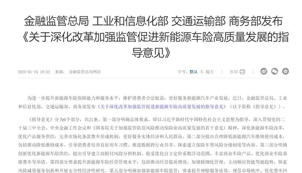 △《关于深化改革加强监管促进新能源车险高质量发展的指导意见》,图源:金融监管总局网站