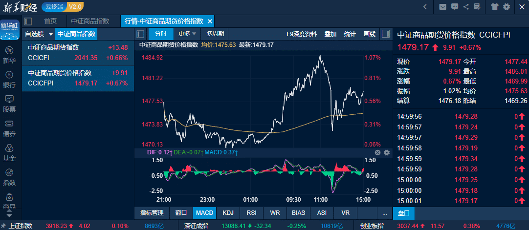 新华财经北京 10 月 16 日电 (吴郑思、张瑶)「反内卷」 相关品种再度发力,推动国内商品期货市场周四 (10 月 16 日) 整体温和回暖。截至收盘时,衡量市场综合价格表现的中证商品期货价格指数收报 1479.17 点,较前一交易日上涨 9.91 点,涨幅 0.67%;中证商品期货指数收报 2041.35 点,较前一交易日上涨 13.48 点,涨幅 0.66%。
