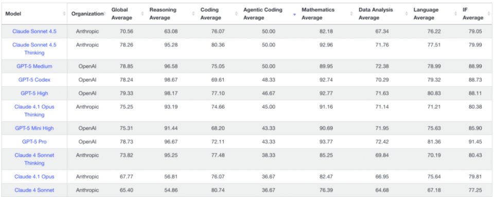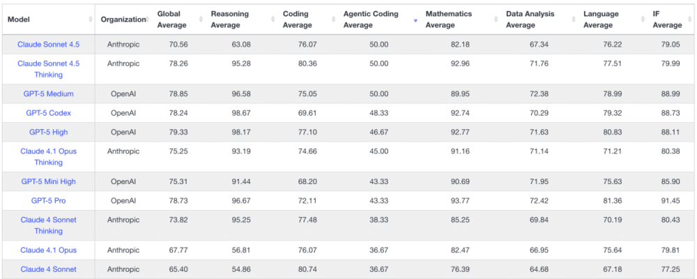 选择 Agentic Coding Average(智能体编程任务平均得分) 后,模型排行榜,Claude Sonnet 4.5 位于第一名。来源:https://livebench.ai/