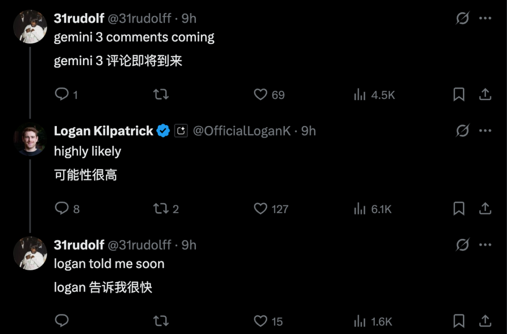 有网友直接问 AI studio 负责人,Gemini 3 是不是即将到来,Logan 回复他说 「可能性很高」。