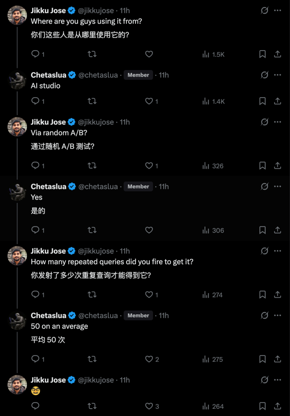 目前这些爆料出来的 Gemini 3 测试,都是在 Google AI Studio 网页上 A/B 测试完成的。