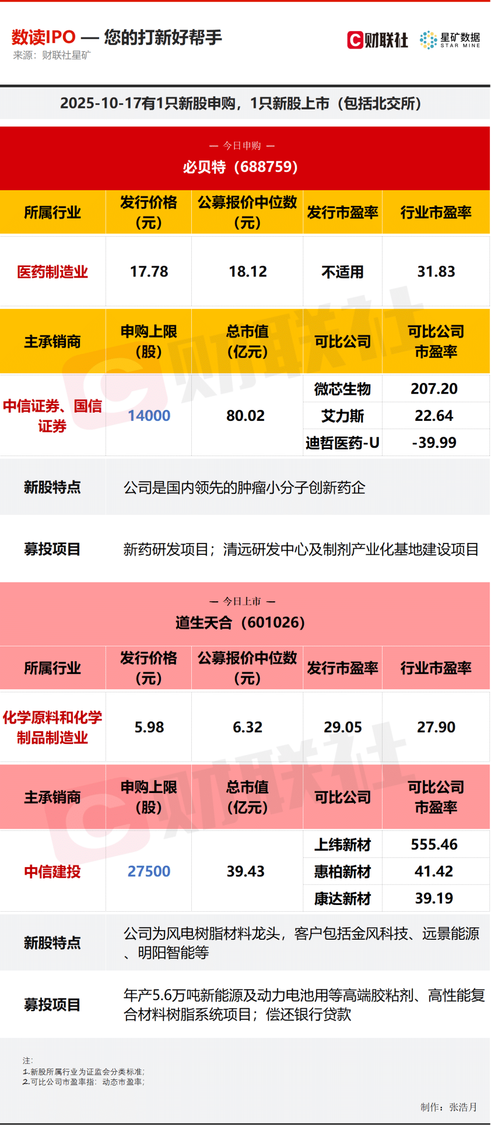 财联社 10 月 17 日讯,今日有 1 只新股申购,为科创板的必贝特;1 只新股上市,为沪市主板的道生天合。