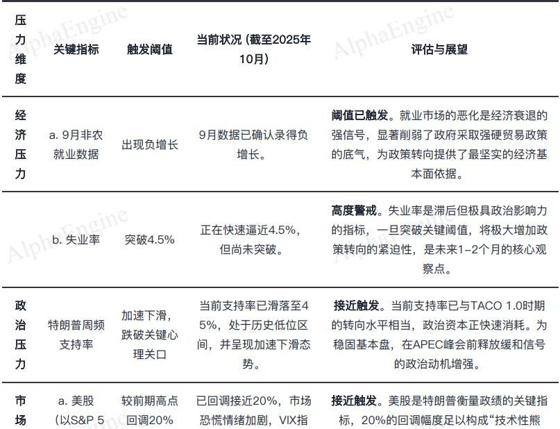 TACO 2.0 的主要特征在于政策转向不再由单一因素触发,而是需要经济、政治、市场三大领域的压力同步达标,且调整节奏更为平缓,需要更长时间累积压力 。