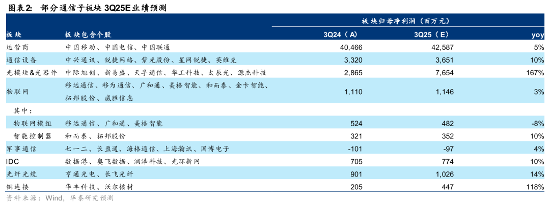 以 38 家我们覆盖的 A/H 通信行业公司为样本,我们预计 3Q25 通信板块合计归母净利润同比增长 15%,剔除三大运营商、中兴通讯权重股后,预计板块归母净利润同比增长 73%。细分来看,电信运营商利润预计稳健增长;光通信板块在海外与国内市场需求延续高增下,业绩有望持续兑现,且产业链景气度预计继续呈扩散趋势;IDC 受益国内外智算中心需求增长有望迎来拐点;铜连接板块业绩有望在产能释放下逐步兑现;光纤光缆景气度有望逐步复苏。