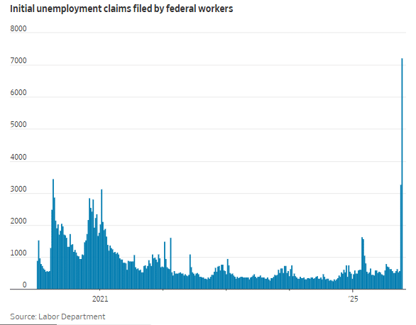 与此同时,随着美国政府停摆的持续,其造成的经济损害无疑也正日益放大。最新数据显示,美国联邦政府工作人员申请失业救济的人数近来已急剧攀升,达到了自 2019 年 1 月结束的 35 天政府关门以来的最高水平。