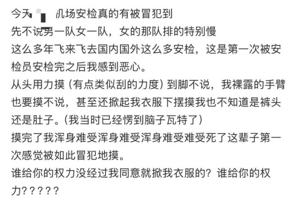 十一黄金周期间,我刷到这么一条笔记,一位旅客说:在某机场过安检时,被摸得 「恶心」,觉得 「被冒犯」。