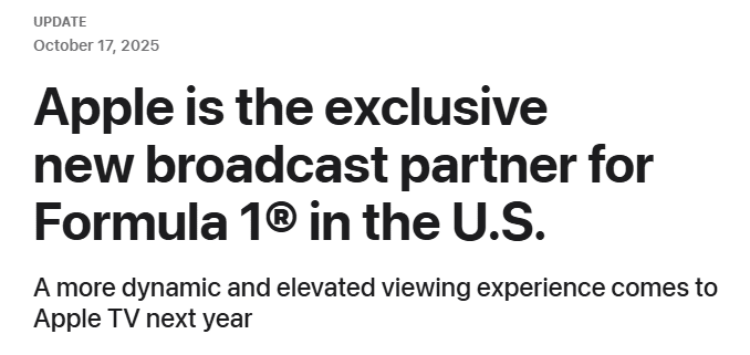 新闻稿称,从明年开始,所有 F1 赛事——包括练习赛、排位赛、冲刺赛、大奖赛正赛——将在美国 Apple TV 上独家转播,赛事均向 Apple TV 订阅用户开放,其中练习赛和部分比赛将免费提供。
