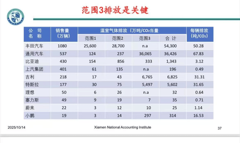 「在汽车行业,范围三的碳排放一般占所有碳排放的 80%-90%,以通用汽车为例,其在 2024 年的销售量为 537 万辆,范围三的碳排放达 36065 万吨,相比之下比亚迪的范围三碳排放甚至低于范围一与范围二之和,两者在统计口径上或存在差异,」 黄世忠教授向虎嗅分析道。