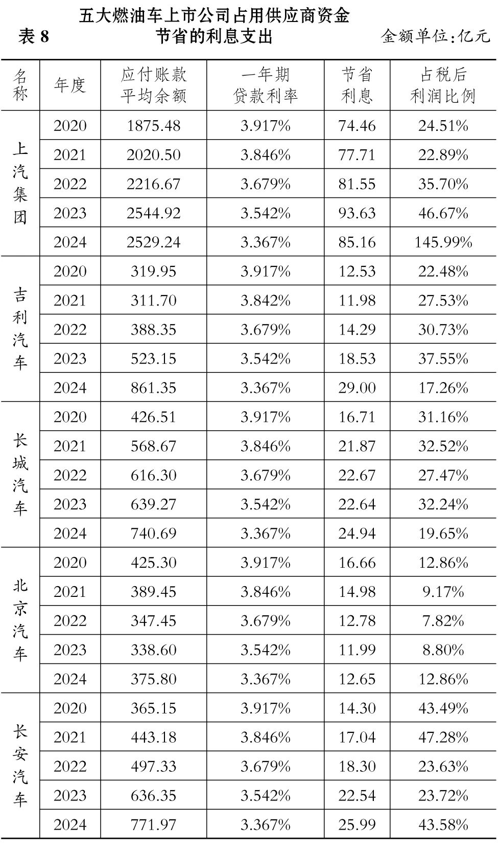 其中,上汽集团 2024 年占用供应商资金的效果最为突出:2529.24 亿元的资金占用节省利息支出 85.16 亿元,占其税后利润的比例高达 145.99%。倘若没有 OPM 战略带来的利息支出节约效应,上汽集团 2024 年的经营将由盈转亏。