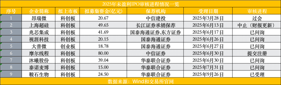 根据上交所相关规定,上市时未盈利,指公司上市前一个会计年度经审计扣除非经常性损益前后净利润孰低者为负。Wind 数据显示,2025 年以来,已有 9 家未盈利性 IPO 获得受理,其中仅大普微是申报创业板,由国泰海通证券保荐。