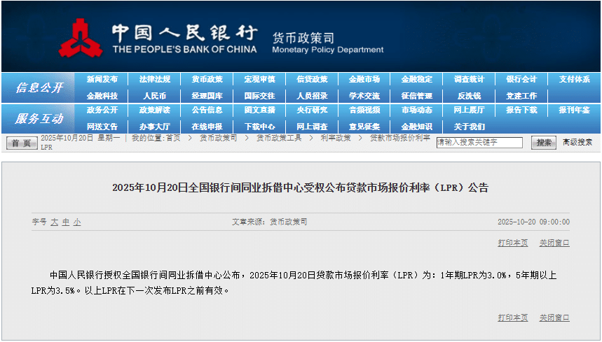 商业动态10 月 LPR 报价出炉:5 年期和 1 年期利率均维持不变 2025 年 10 月 20 日2025 年 10 月 20 日37 文章来源:财联社 财联社 10 月 20 日讯,10 月贷款市场报价利率 (LPR) 报价出炉:5 年期以上 LPR 为 3.5%,上月为 3.5%。1 年期 LPR 为 3%,上月为 3%。