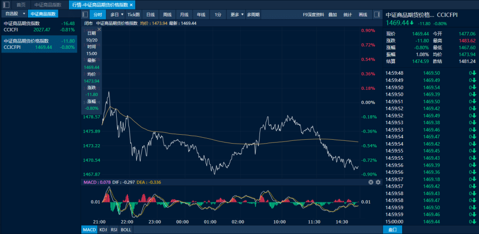 截至 20 日下午收盘,中证商品期货价格指数收报 1469.44 点,较前一交易日下跌 11.80 点,跌幅 0.80%;中证商品期货指数收报 2027.47 点,较前一交易日下跌 16.48 点,跌幅 0.81%。