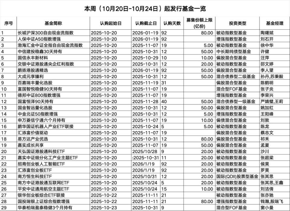 新基金发行市场继续保持暖意。本周 (10 月 20 日—10 月 24 日)5 个交易日中,共有 29 只新基金登台亮相,面向投资者公开发行。