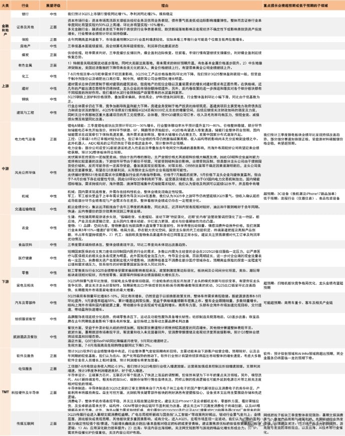 细分领域有哪些亮点?结合中金行业分析师自下而上反馈:1) 能源、原材料行业:有色金属板块,需求转好预期升温下,有色金属价格逐步回升,黄金价格再创新高,板块有望实现较好业绩表现;煤价在供给收缩及需求向好支撑下反弹回升,煤炭盈利或边际恢复;化工品三季度需求偏弱,价格同环比均有下降,整体盈利表现平淡,但制冷剂、磷肥等细分赛道受益于商品涨价业绩或同比增长;需求偏弱叠加地产基建下行,钢铁及建材盈利仍相对偏弱,但行业持续产能出清以及反内卷政策的进一步落实有望带来一定利好。2) 中游制造:电力设备方面,锂电三季度出货环比稳步增长,价格整体稳健,部分环节率先涨价;储能在政策支持下高速增长,海外需求逐步释放;工控订单相对出色,实现业绩传导仍需一定时间,机器人、AIDC 稳步推进;电力设备部分企业受抢装后淡季以及高基数影响,但海外布局较好企业有望迎来业绩收获期。光伏产业链方面,「反内卷」 推动主产业链及辅材价格反弹,盈利能力有所改善,下游组件顺价不明显,可能受到一定压制,但部分龙头受益于低价库存优势以及海外扰动因素减弱,存在业绩超预期可能。逆变器及储能需求向好,业绩环比预计稳中有增。机械方面,需求筑底叠加外需结构性机会,业绩兑现确定性较强。交运方面,航运业绩表现分化,油运、干散以及集运近洋和内贸表现占优;反内卷提价效果支撑快递三季度业绩表现。有望超预期的领域包括:铁锂正极、3C 设备等;流程行业、食品包装设备或低于预期。3) 下游消费:必选消费方面,食品饮料板块需求持续承压,整体业绩表现平淡。医药板块医保收支剪刀差抑制行业需求,以内需为主的企业业绩相对承压,系统性好转尚待医保收入回升。农林牧渔板块,传统猪周期规律逐步失效,周期长度缩短及波动下降特征强化。可选消费方面,内需偏弱环境下,传统零售、旅游餐饮、品牌服饰等业绩表现相对偏弱;美妆、潮玩等新消费领域表现延续占优。关税落地后,家电、汽车等出口链企业环比改善,以旧换新政策以及新车密集上市等因素支撑乘用车表现,商用车受益于海外市场交付提速盈利快速增长。有望超预期的领域包括:扫地机器人龙头、商用车重卡、客车及相关产业链。4)TMT 领域:科技硬件板块中,半导体设计方面,模型迭代、AIoT 新终端发布,相关领域如 SoC、端侧存储等建议关注;国产替代新项目及消费电子补库支撑半导体制造订单;消费电子中手机市场表现平稳,仍需关注关税变化,零部件看好光学、结构件、ODM 等部分供应链环节盈利能力改善。海外 AI 算力需求旺盛,PCB和服务器 ODM 厂商或具有较好利润弹性。软件板块,受益于下游客户经营企稳及低基数效应,业绩稳中有进。传媒板块,行业进入暑期文娱消费旺盛期,叠加利好政策频出,景气度上行,游戏板块业绩表现亮眼,其余领域存在分化。电信板块,营业收入放缓,利润增速在运营商加强成本控制及折旧增速放缓支撑下好于收入增速。有望超预期的领域包括:信创、AI Infra、网络游戏、暑期文娱消费等。5) 金融地产:资本市场高活跃度支撑券商经纪及信用业务表现,单季度盈利有望同比高增,保险在去年高基数背景下有望延续较好增长;银行盈利水平表现平稳。地产方面,三季度基本面延续疲弱,利润率仍处于寻底状态。