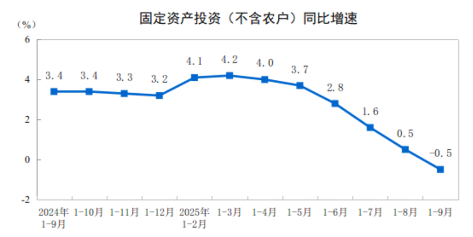2025 年 1—9 月份,全国固定资产投资 (不含农户)371535 亿元,同比下降 0.5%(按可比口径计算,详见附注 7)。其中,民间固定资产投资同比下降 3.1%。从环比看,9 月份固定资产投资 (不含农户) 下降 0.07%。