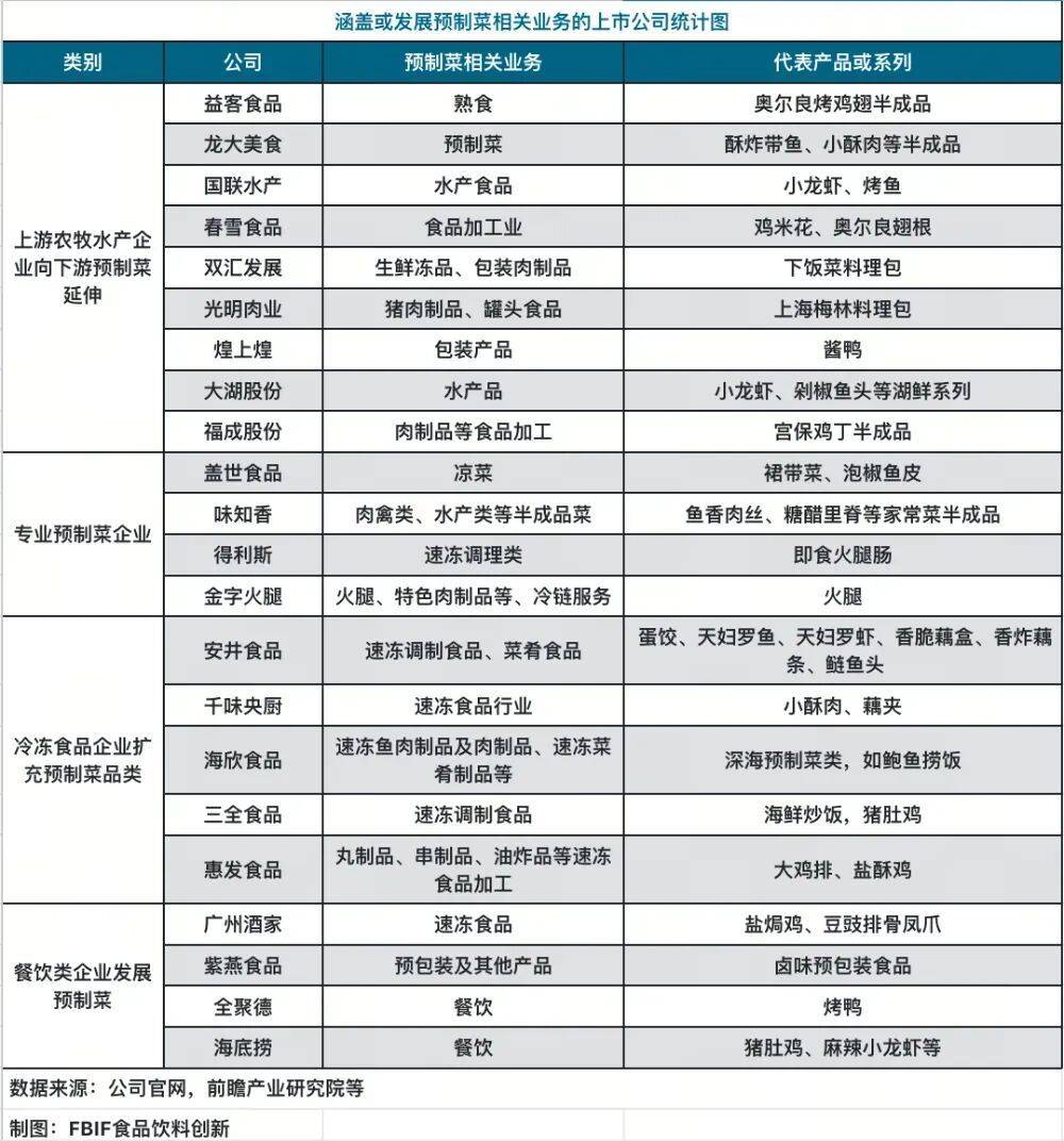 据 FBIF 不完全统计,目前,上市公司中,涵盖或已经在发展预制菜相关业务的企业可以分为四大类,分别是上游从农牧水产业务向下游预制菜延伸的企业,从冷冻食品扩充预制菜品牌的企业,从餐饮类切入预制菜企业以及专业预制菜企业。