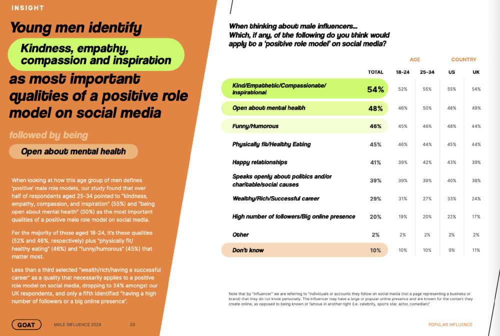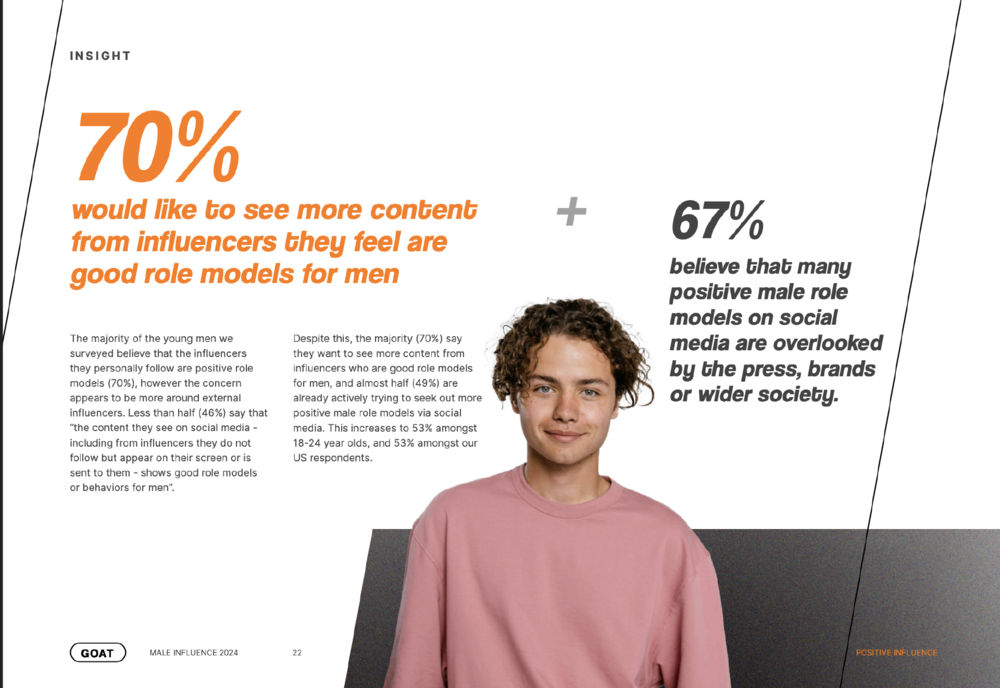 「70% 的受访者希望在社交平台上看到更多男性榜样的内容,同时 67% 的受访者认为,现在很多正向男性榜样被媒体和品牌忽视了。」