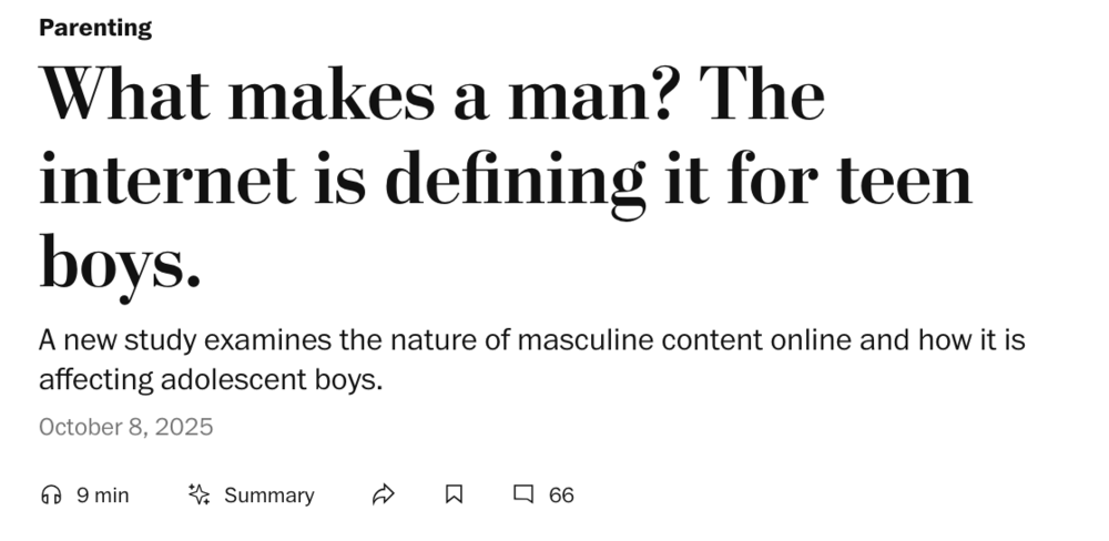 「... 研究指出,网络网红已经成为青少年男孩获取指导和情感支持的重要来源——这是一个显著的世代转变,因为以往的几代人主要依赖亲属、社区成员或传统媒体来寻找男性榜样...」