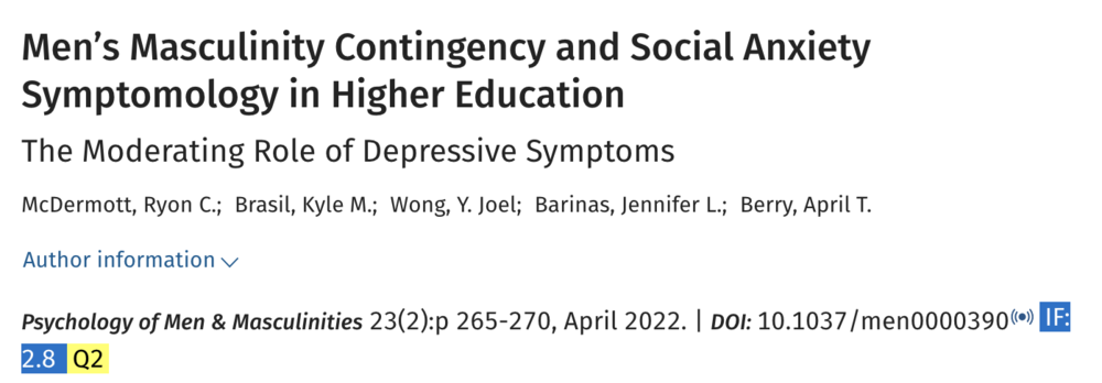 2022 年以美国大学男生为样本的 《高等教育中男性男子气概依赖性与社交焦虑症状研究》 也指出,不男人没价值的观念与社交焦虑、抑郁症呈正相关。