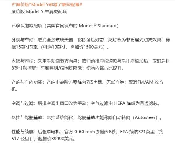 有汽车博主整理了 ModelY 标准版的减配项,除了减少车内配置和功能之外,汽车续航 「缩水」 了,也没有配备特斯拉的 Autopilot 自动辅助驾驶,仅搭载了交通感知巡航控制系统。