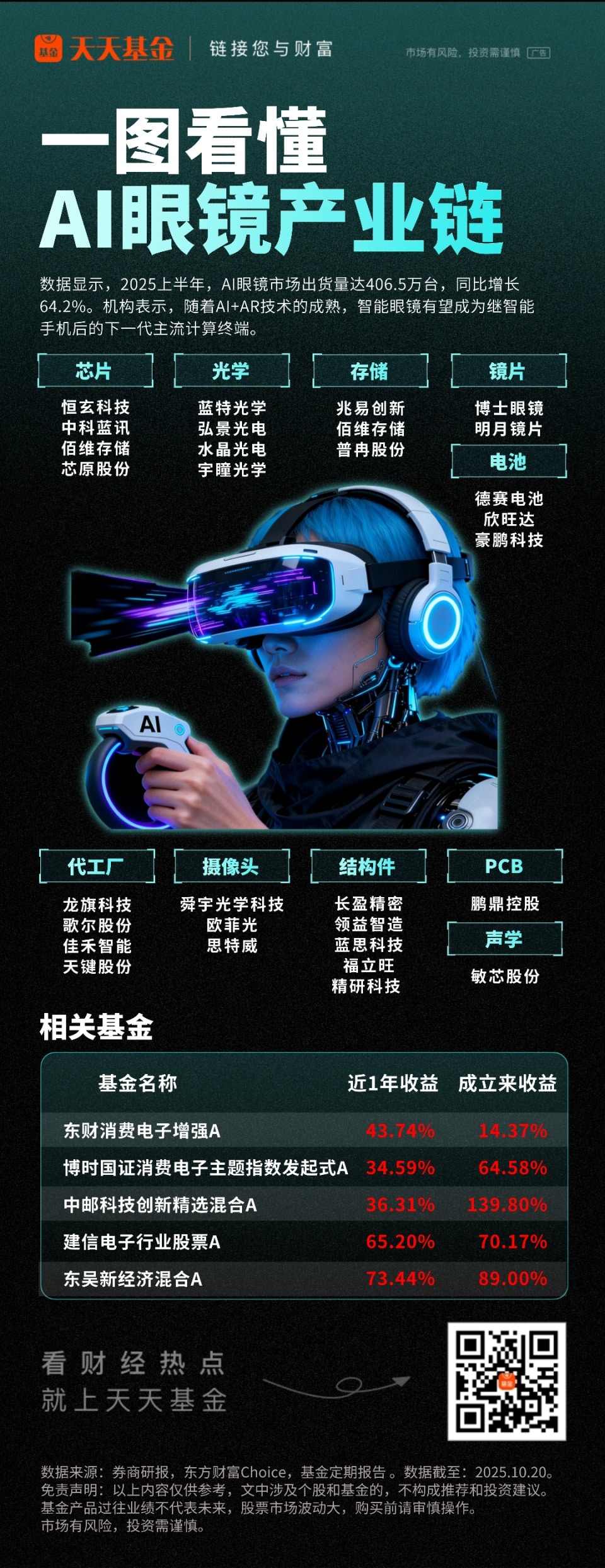 据证券时报网报道,10 月 20 日,国际数据公司 (IDC) 发布报告显示,2025 上半年,全球智能眼镜 (AI 眼镜) 市场出货量达 406.5 万台,同比增长 64.2%。未来,随着产品形态持续创新、应用场景不断拓宽,智能眼镜有望成为下一代人机交互入口,为消费电子市场带来新增长动力。