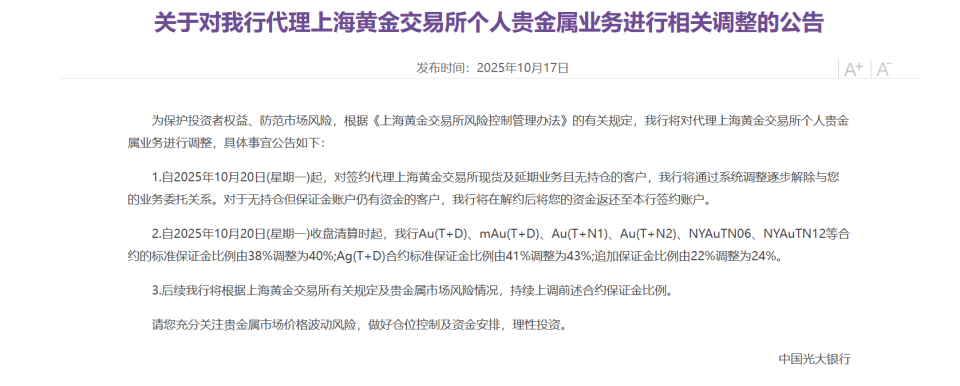 近日,光大银行发文称,自 10 月 20 日 (星期一) 起,对签约代理上海黄金交易所现货及延期业务且无持仓的客户,该行将通过系统调整逐步解除业务委托关系。同时,光大银行还将调整合约保证金。