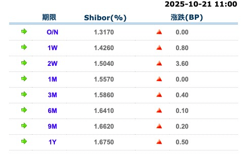 上海银行间同业拆放利率 (Shibor) 短期品种整体微升。具体来看,隔夜 Shibor 与前日持平,报 1.3170%;7 天 Shibor 上涨 0.80BP,报 1.4260%;14 天 Shibor 上涨 3.60BP,报 1.5040%。