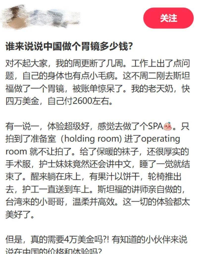 社交平台上,有华人做了一次普通胃镜,环境和享受的服务是真的好。账单到手——总费用 4 万美金、保险公司报销后还需要自付 2600 美金。
