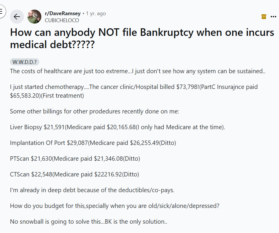 Reddit 上,有网友吐槽自己因癌症治疗陷入债务泥潭:光是第一次化疗,账单就高达 7 万多美元,即便有 Medicare 保险,也还得自掏腰包 8 千多美金。破产可能是自己唯一的出路。